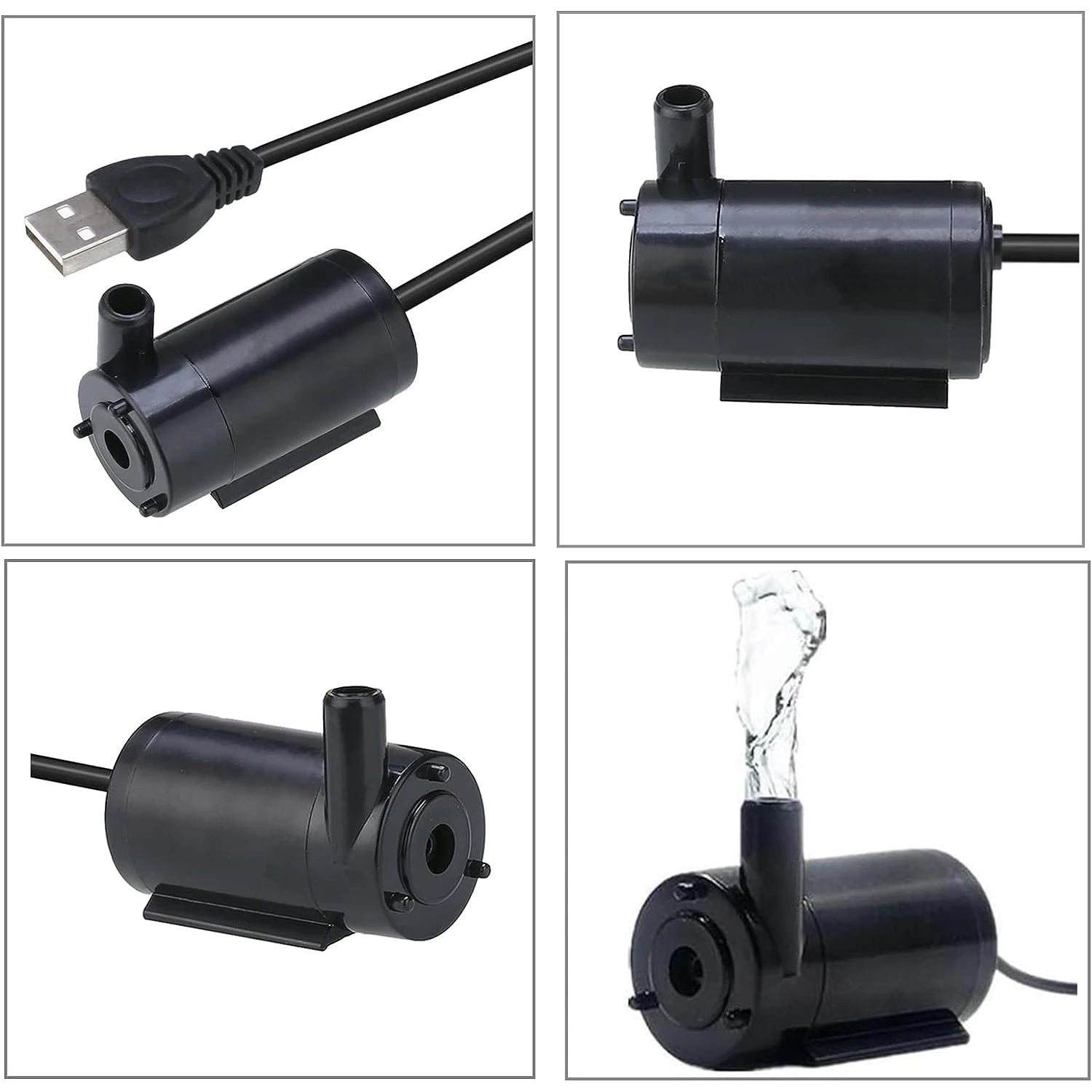 Compact and quiet water pump, ideal for aquariums, ponds, fountains, and hydroponic systems. Powered by a low-voltage USB cable (3-5V), it features a brushless motor for long life and efficient performance. Easy to install, it's perfect for keeping water circulating without disturbing your home or aquatic environment.