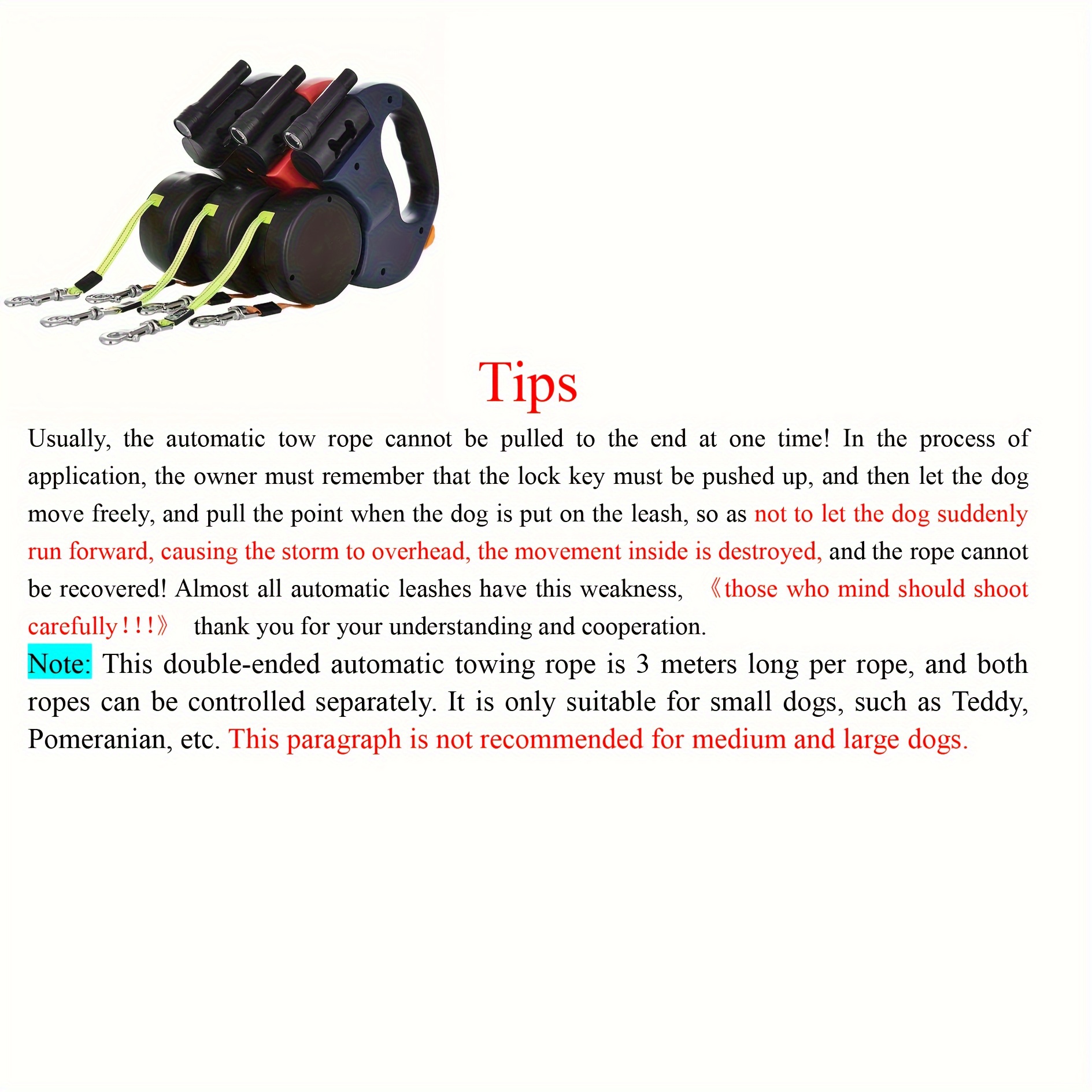 This double-ended automatic leash has a length of 3 meters for each rope, which can be controlled separately.