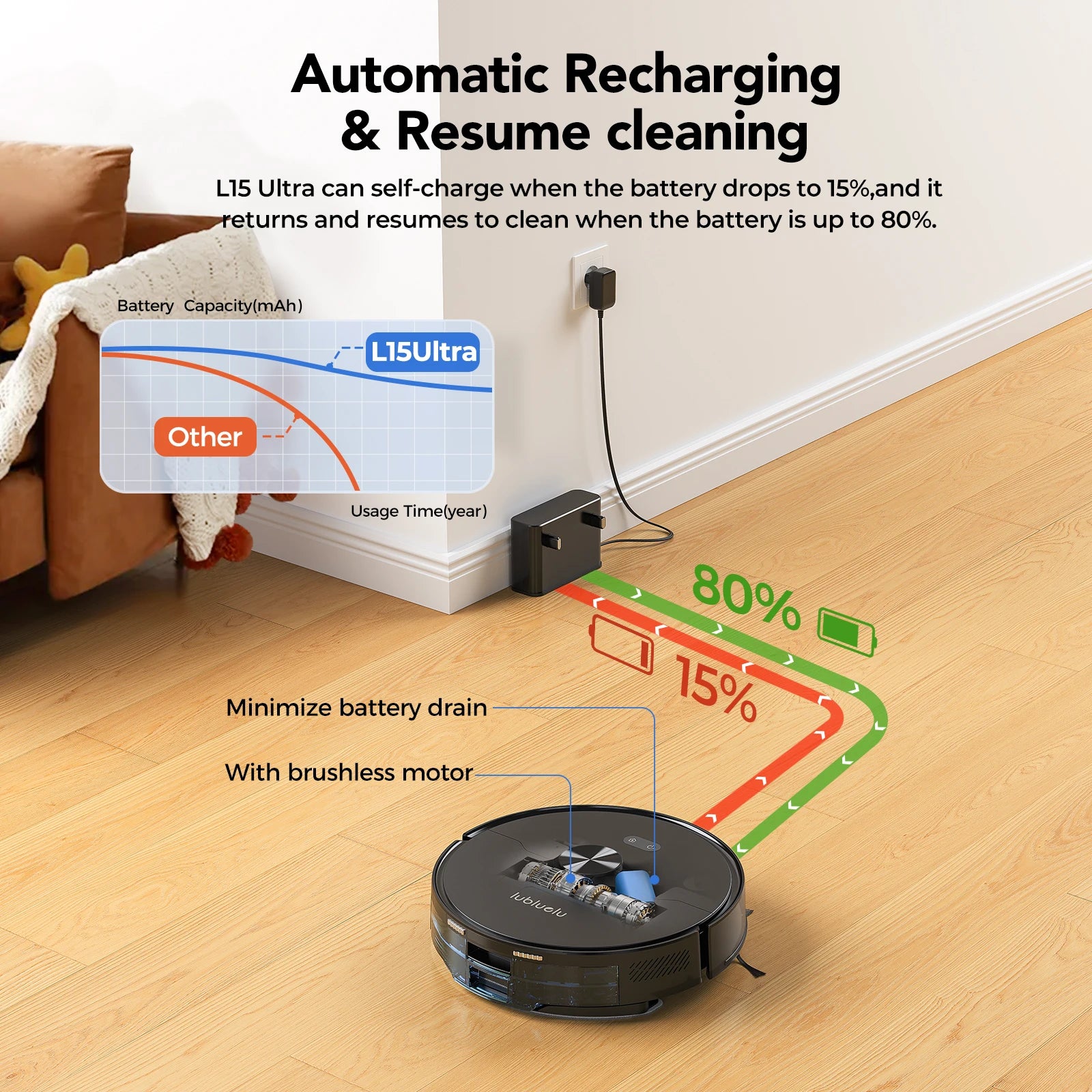 Autonomia Estesa: Pulisce fino a 150mq con una singola carica (150 min), tornando da solo alla base per ricaricarsi.